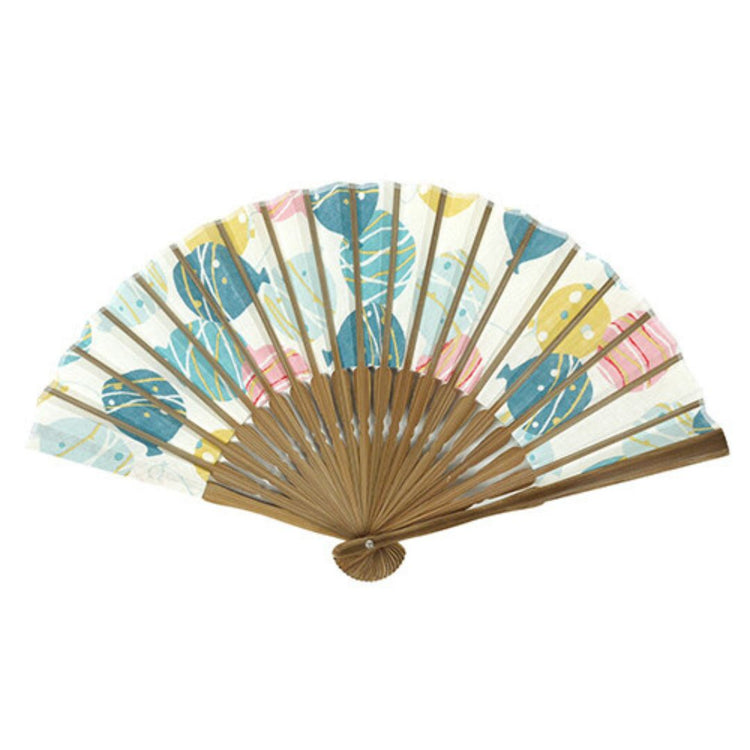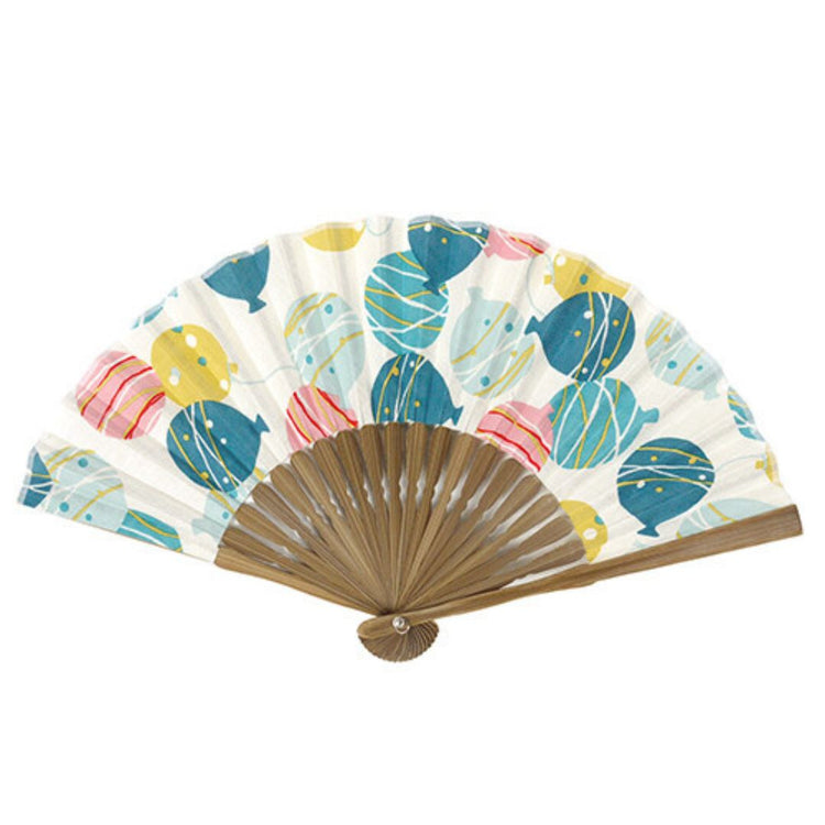 Er zijn waaiers met verschillende motieven, dus er is er vast één die aan jouw smaak voldoet. Deze bijvoorbeeld met Japanse yoyo ballonnen erop. Yoyo Tsuri is een Japans zomerspel. Je probeert een ballon uit het water te vissen met een touwtje van papier waaraan een haakje vastzit. De waterballonnen hebben rubberen koordjes met lange lussen eraan bevestigd. Zo'n yo-yo is zwaar en het papieren touwtje niet waterbestendig: als je te lang wacht, breekt het papieren touwtje en verlies je de yo-yo.