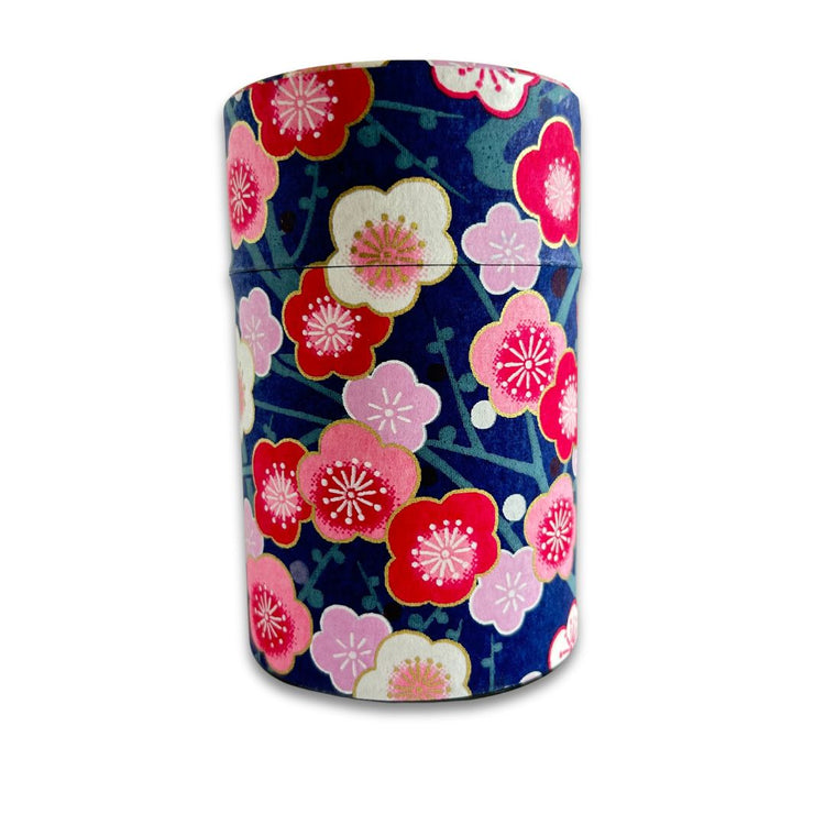 Een Japanse theeblik met ume bloesems op een blauwe achtergrond. Ideaal om je losse theeblaadjes in te doen. Het plastic deksel zorgt ervoor dat je thee vacuüm bewaard wordt en dus langer vers blijft!