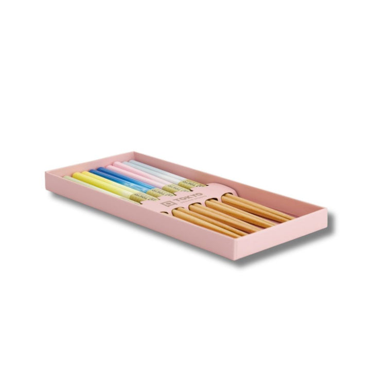 Deze prachtige o-hashi, de Japanse naam voor eetstokjes, zijn gemaakt van bamboe en ze zijn hebben verschillende (iro-iro) heldere, vrolijke kleuren Ze zitten verpakt in een prachtig bewaardoosje.