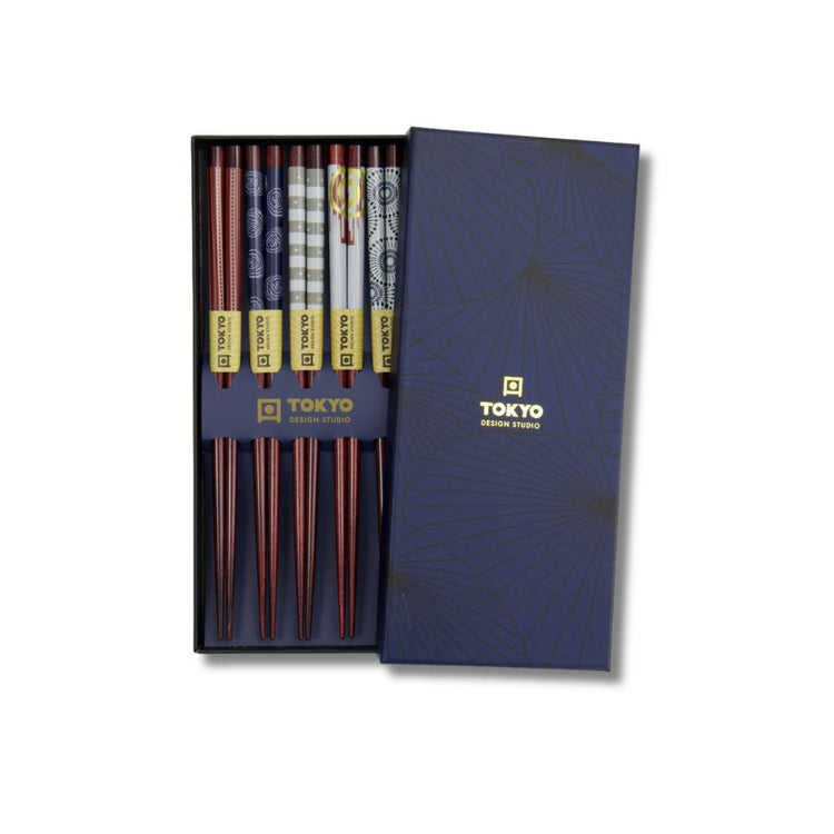 Deze prachtige o-hashi, de Japanse naam voor eetstokjes, zijn gemaakt van bamboe en ze zijn versierd met 5 verschillende stijlvolle patronen. Ze zitten verpakt in een prachtig bewaardoosje.