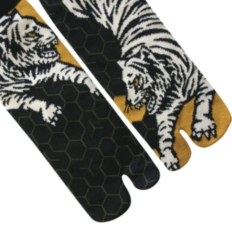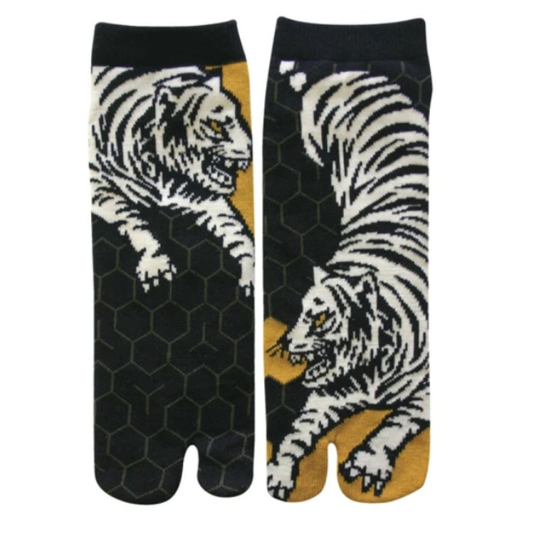 Draag deze stoere tijgers, want tora is de Japanse naam voor deze viervoeter, aan je voeten. Kan in je schoenen of in je teenslippers, want daar zijn Japanse tabi sokken uitermate geschikt voor!